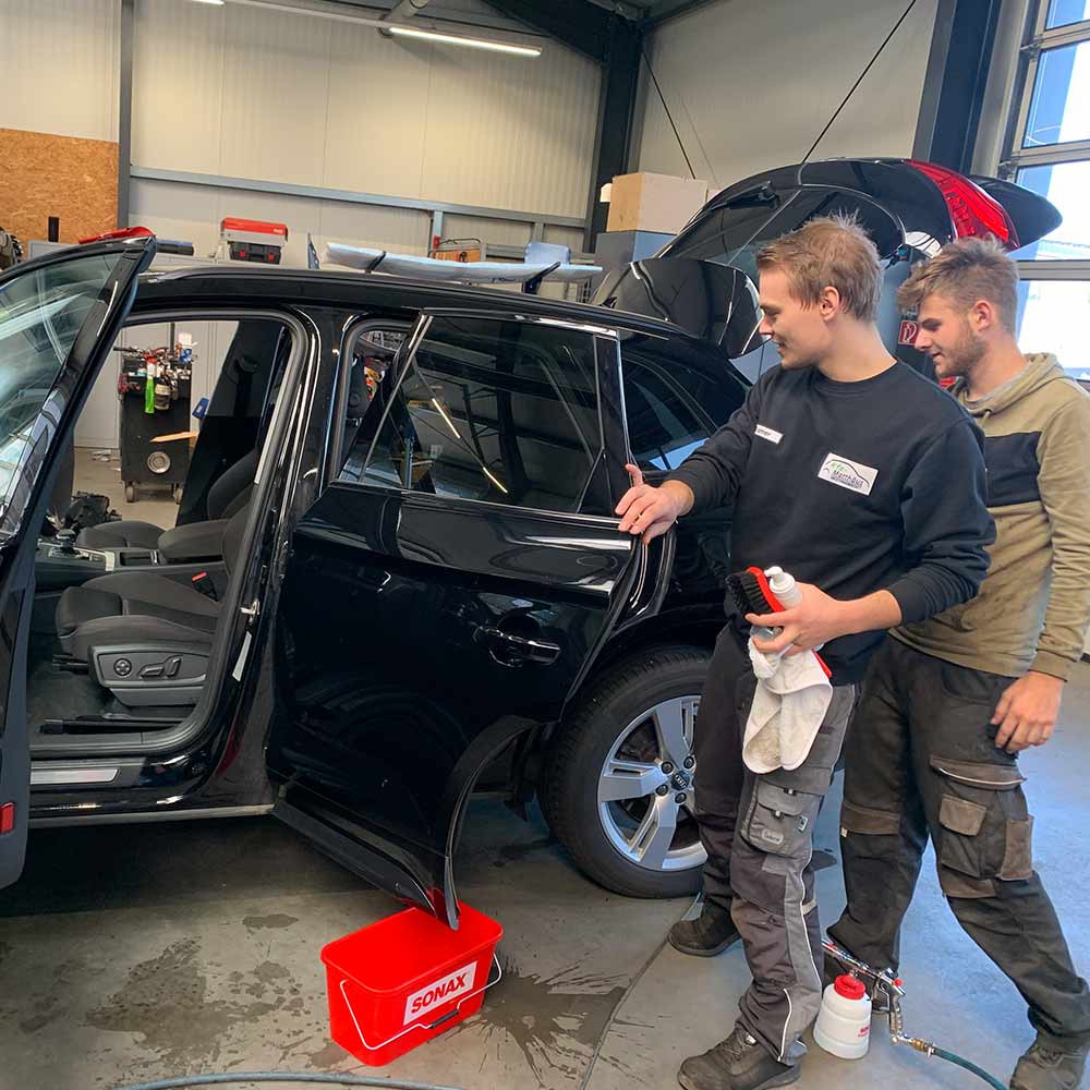 Maximilian Kramer und Michel Fehrmann nahmen an dem Basis-Lehrgang zum Thema Fahrzeugaufbereitung teil. Der Lehrgang wurde von Thorsten Ewe (Master Trainer bei SONAX), bei uns in der Werkstatt durchgeführt.